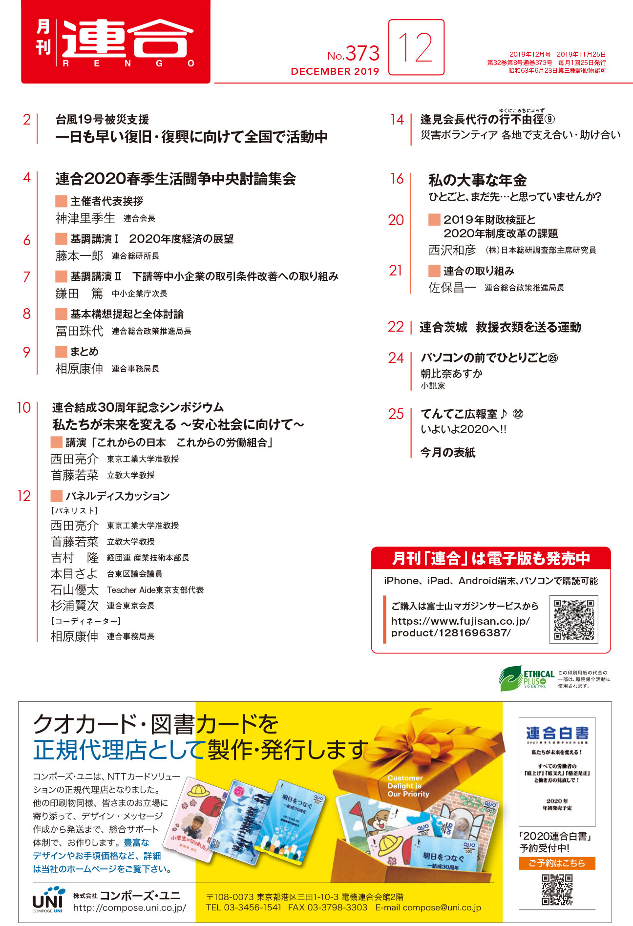 台風19号により、各地で甚大な被害が発生しました。お亡くなりになられた方々に謹んで哀悼の意を表します。また家屋倒壊や浸水、土砂災害などで、今も多くの方々が避難されています。心よりお見舞い申し上げます。連合は、「2019 台風19号連合対策本部」を設置し、構成組織、地方連合会の協力のもと、カンパ、ボランティアなどの支援活動を展開しています。何とか被災地の力になりたいと、全国から多くの仲間が、福島、長野、栃木、宮城をはじめ広範な被災地で汗しています。一日も早い復旧・復興に向けてこれからも力を合わせていきます。
