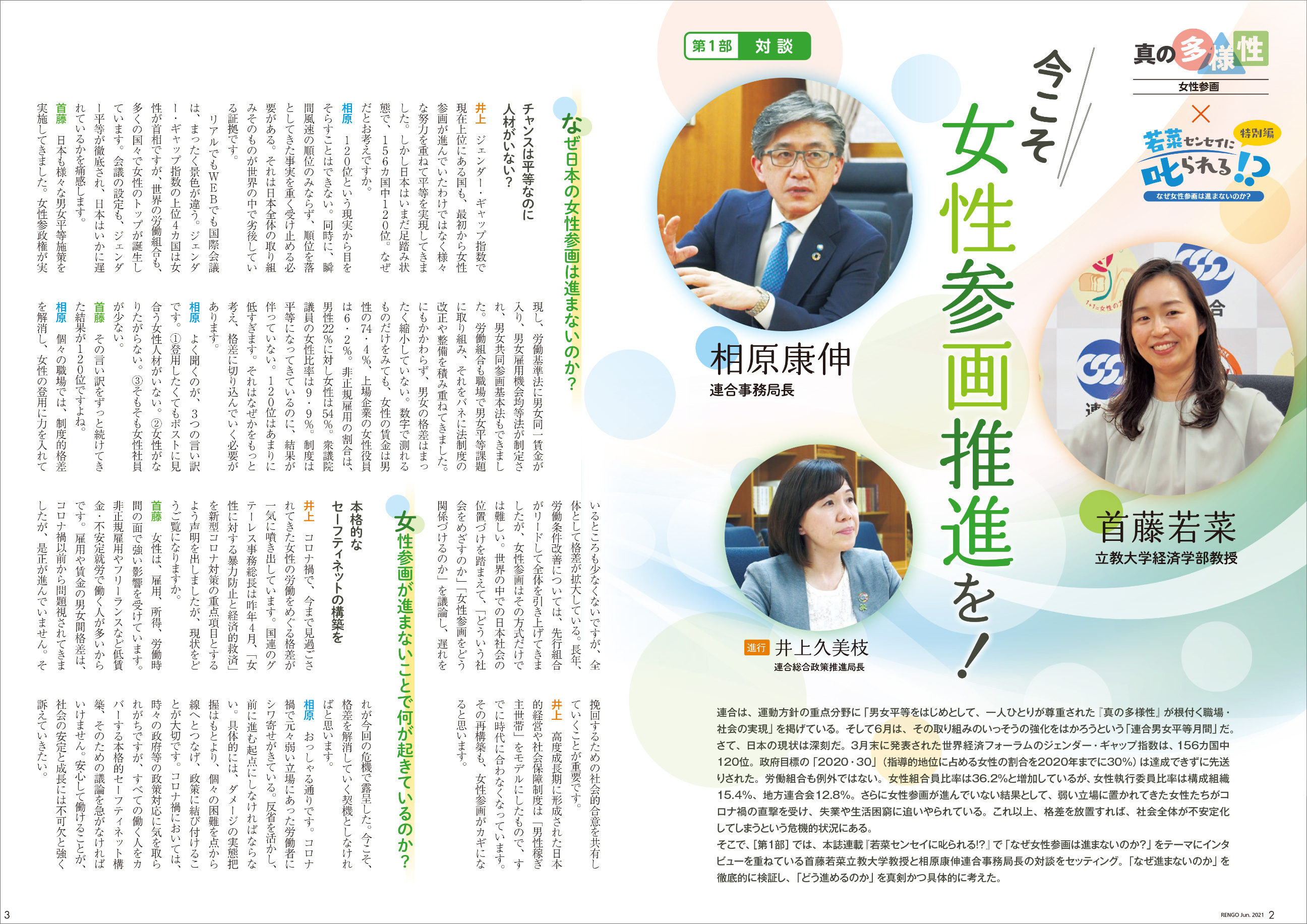 [第1部]では、本誌連載『若菜センセイに叱られる!?』で、労働組合で「なぜ女性参画は進まないのか?」をテーマにインタビューを重ねている首藤若菜立教大学教授と相原康伸連合事務局長の対談をセッティング。「なぜ進まないのか」を徹底的に検証し、「どう進めるのか」を真剣かつ具体的に考えた。