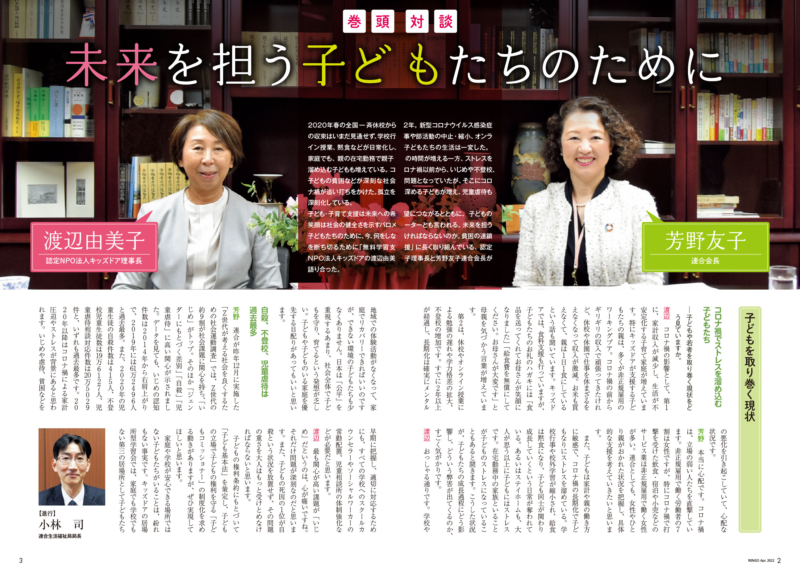 子ども・子育て支援は未来への希望につながるとともに、子どもの笑顔は社会の健全さを示すバロメーターとも言われる。未来を担う子どもたちのために、今、何をしなければならないのか。貧困の連鎖を断ち切るために「無料学習支援」に長く取り組んでいる、認定NPO法人キッズドアの渡辺由美子理事長と芳野友子連合会長が語り合った。