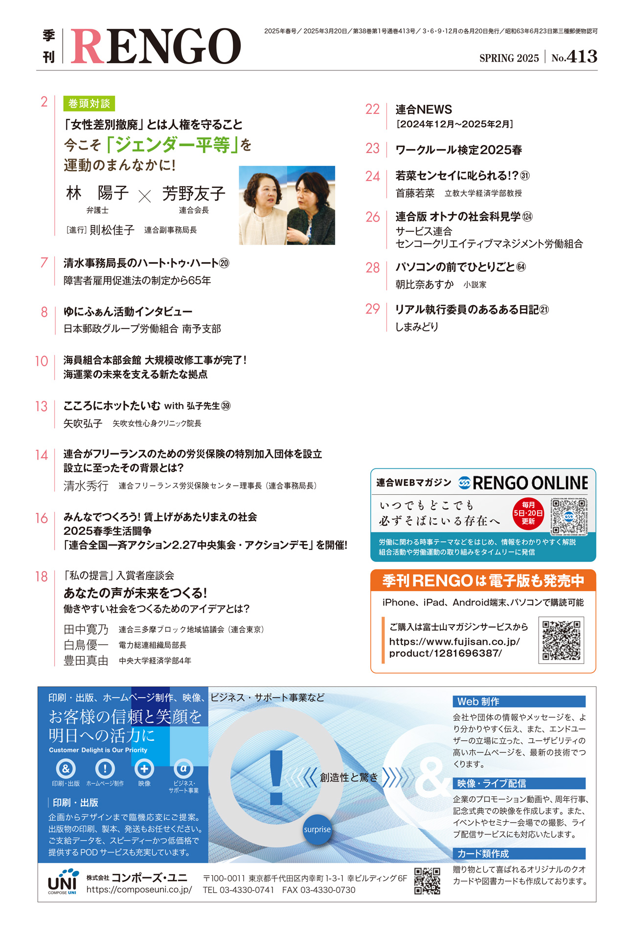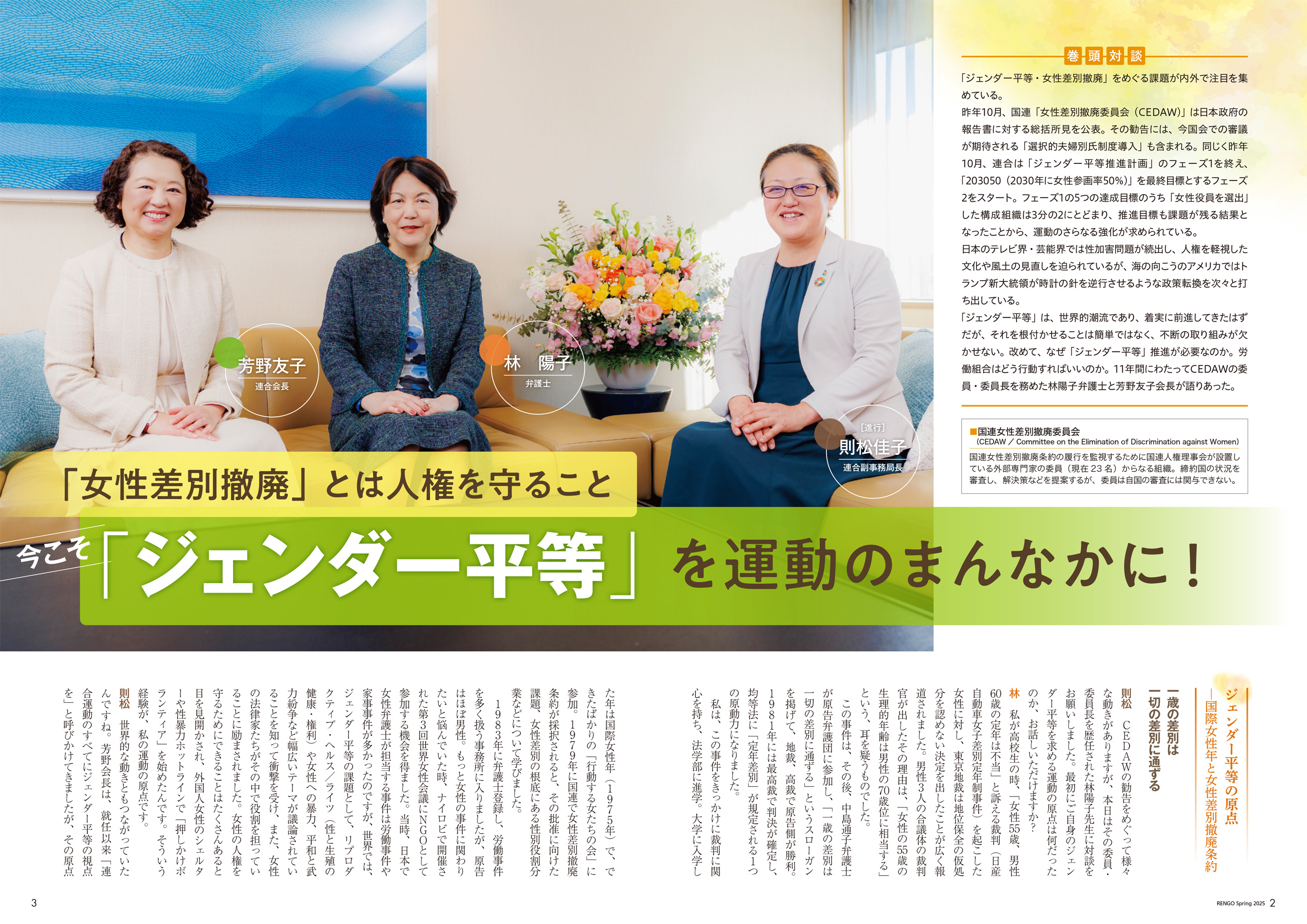 「ジェンダー平等」は、世界的潮流であり、着実に前進してきたはずだが、それを根付かせることは簡単ではなく、不断の取り組みが欠かせない。改めて、なぜ「ジェンダー平等」推進が必要なのか。労働組合はどう行動すればいいのか。11年間にわたってCEDAWの委員・委員長を務めた林陽子弁護士と芳野友子会長が語りあった。