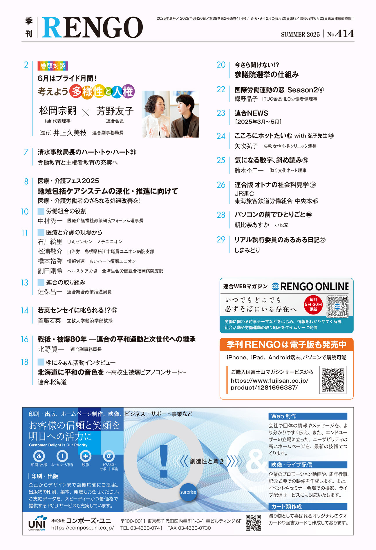 連合は、今期運動方針で「ジェンダー平等・多様性推進」を重点分野に掲げているが、性的マイノリティに関する情報発信を行う一般社団法人fairの松岡宗嗣代表理事は「ジェンダー平等とLGBTQ+の問題は、同じ根を持つ地続きの問題」と指摘。様々な動きが錯綜する現状をどう捉えればいいのか。なぜ多様性の推進が求められるのか。労働組合に求められる役割は何か。松岡代表理事と芳野会長が語り合った。