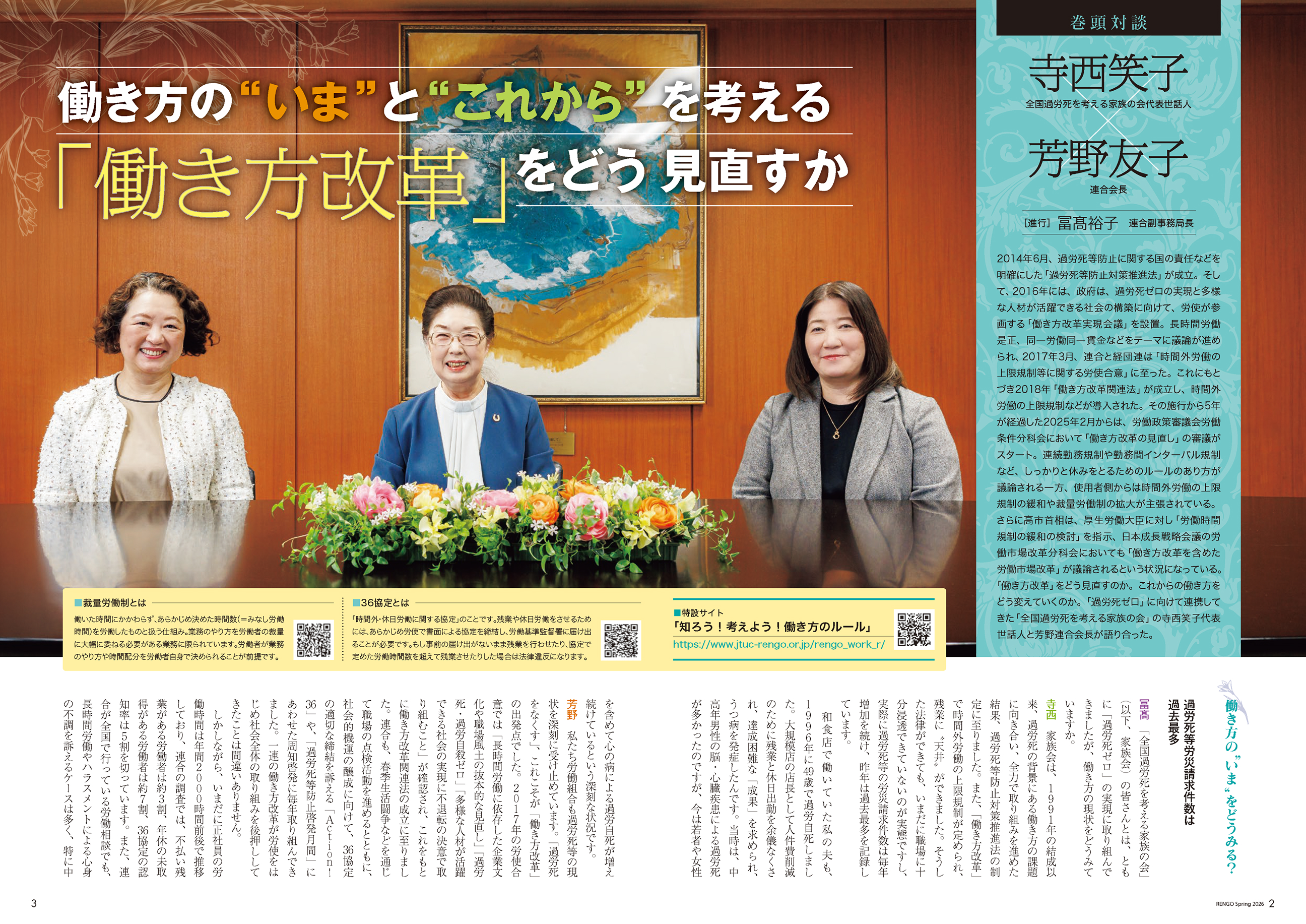 2014年6月、過労死等防止に関する国の責任などを明確にした「過労死等防止対策推進法」が成立。そして、2016年には、政府は、過労死ゼロの実現と多様な人材が活躍できる社会の構築に向けて、労使が参画する「働き方改革実現会議」を設置。長時間労働是正、同一労働同一賃金などをテーマに議論が進められ、2017年3月、連合と経団連は「時間外労働の上限規制等に関する労使合意」に至った。これにもとづき2018年「働き方改革関連法」が成立し、時間外労働の上限規制などが導入された。その施行から5年が経過した2025年2月からは、労働政策審議会労働条件分科会において「働き方改革の見直し」の審議がスタート。連続勤務規制や勤務間インターバル規制など、しっかりと休みをとるためのルールのあり方が議論される一方、使用者側からは時間外労働の上限規制の緩和や裁量労働制の拡大が主張されている。さらに高市首相は、厚生労働大臣に対し「労働時間規制の緩和の検討」を指示、日本成長戦略会議の労働市場改革分科会においても「働き方改革を含めた労働市場改革」が議論されるという状況になっている。「働き方改革」をどう見直すのか。これからの働き方をどう変えていくのか。「過労死ゼロ」に向けて連携してきた「全国過労死を考える家族の会」の寺西笑子代表世話人と芳野連合会長が語り合った。